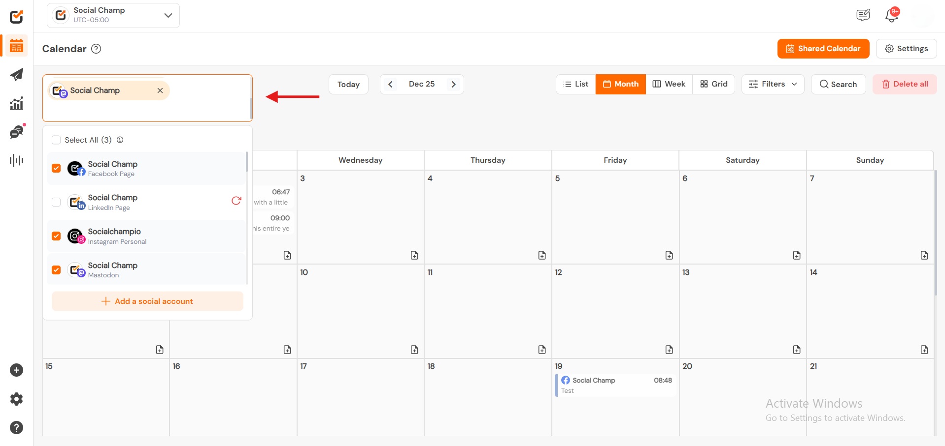 - From the top left drop-down menu, select the social media accounts for which you want to see the scheduled post.