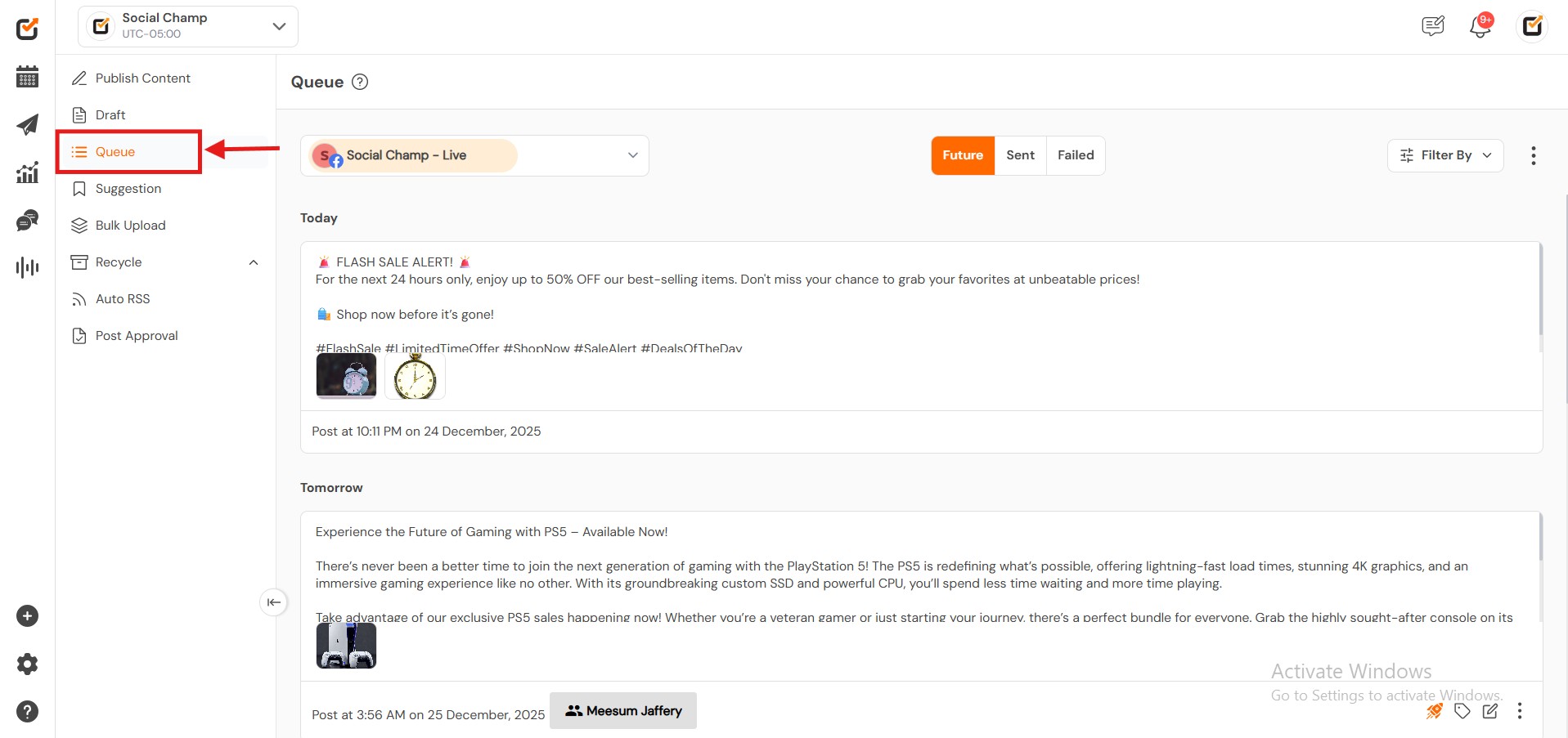 - Choose ‘Queue’ from the left column and select the social media account from the top left drop-down.