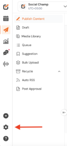 - Log in to your Social Champ account, and you will land on the main Publish content dashboard. Click on the Settings option from the bottom left corner (⚙️Gear/cog icon)