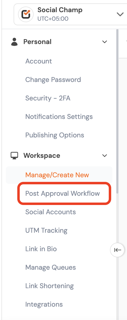 - You will land on the Settings menu, where you can navigate to Workspace and click on Post Approval Workflow.