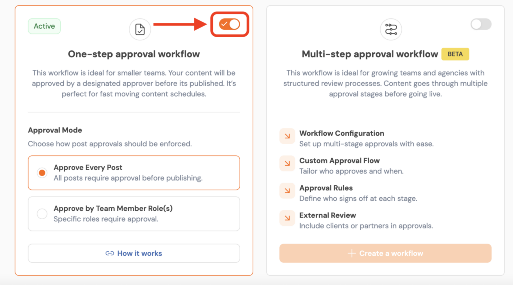 - You can enable approval for a specific social media account or for all social media accounts within the workspace.