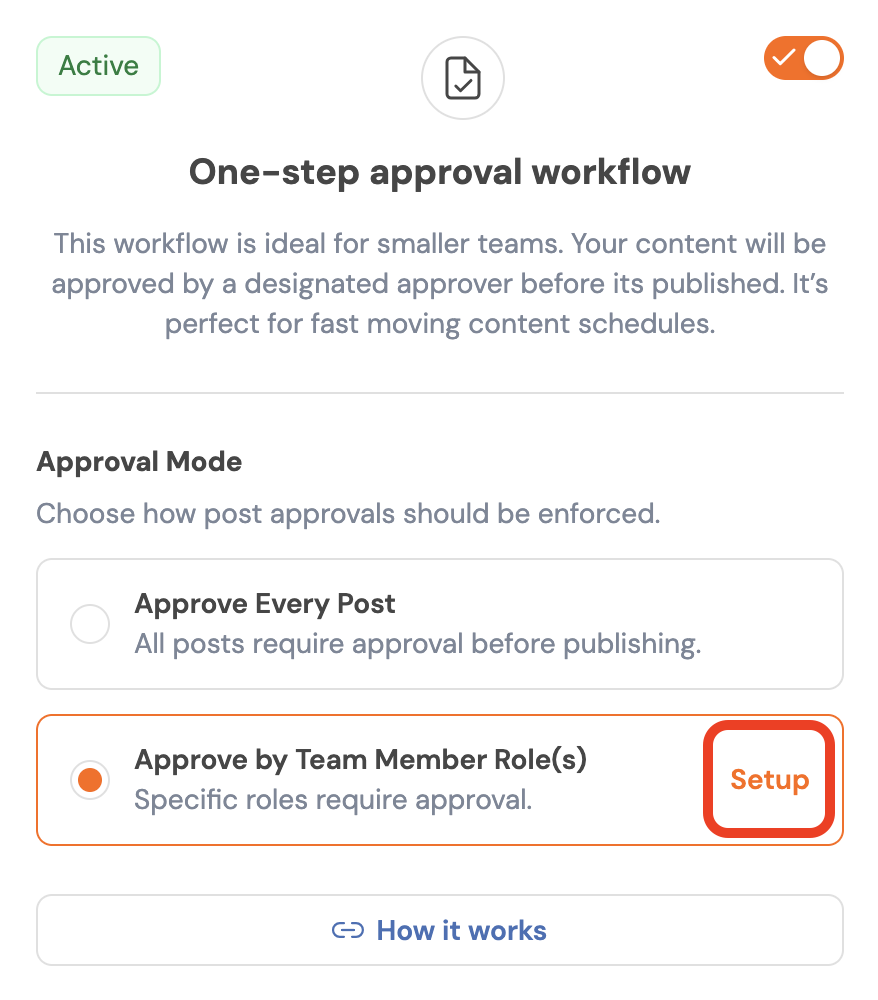The Post Approval Workflow setting requires all scheduled posts for any social account within the workspace to go through the approval process first, even if created by a team member or the workspace owner.