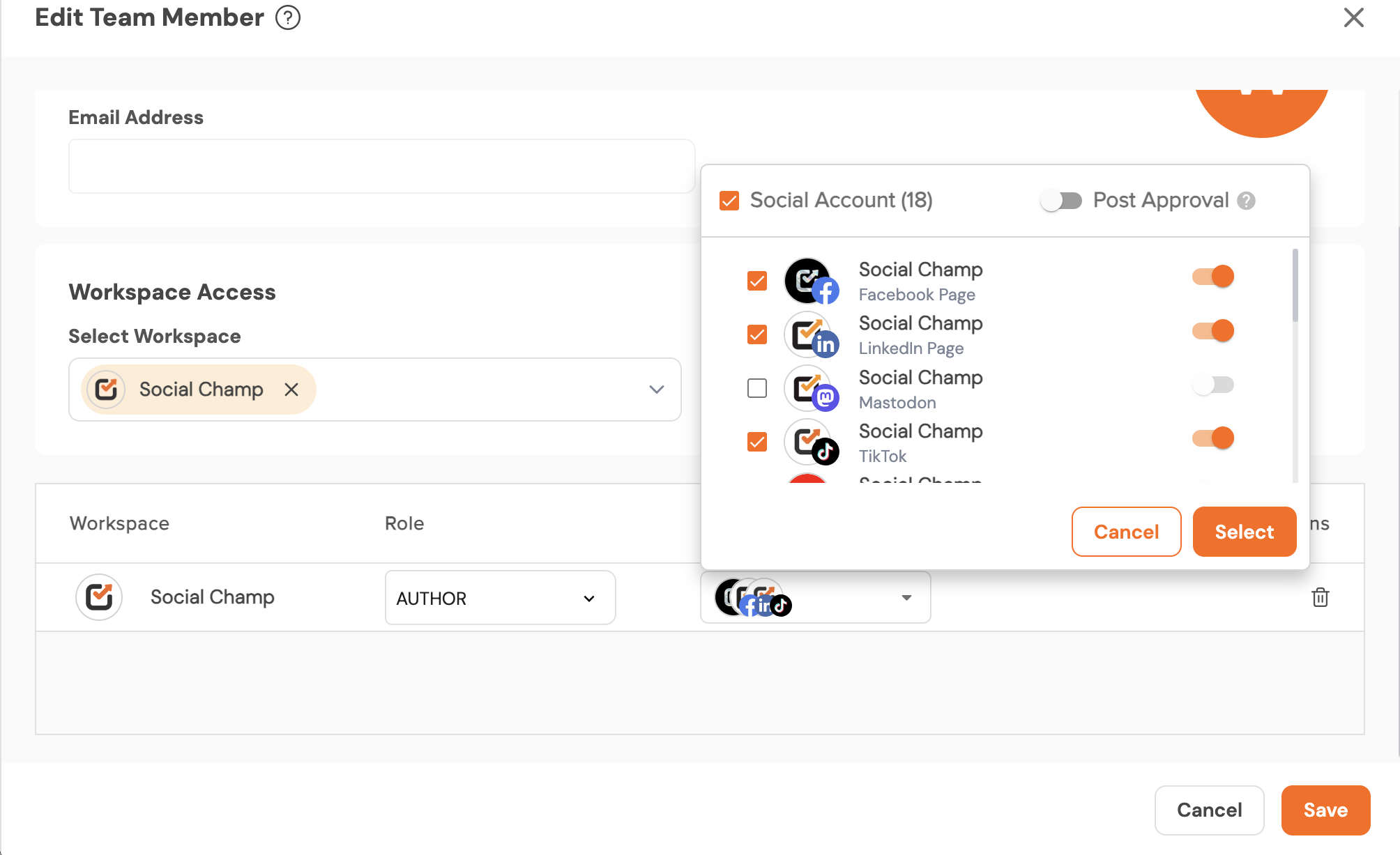 - The account Admin/Owner can control this by selecting “Approve by Team Member Role.” They can also choose the specific social accounts for which post approval should be enabled for that team member.