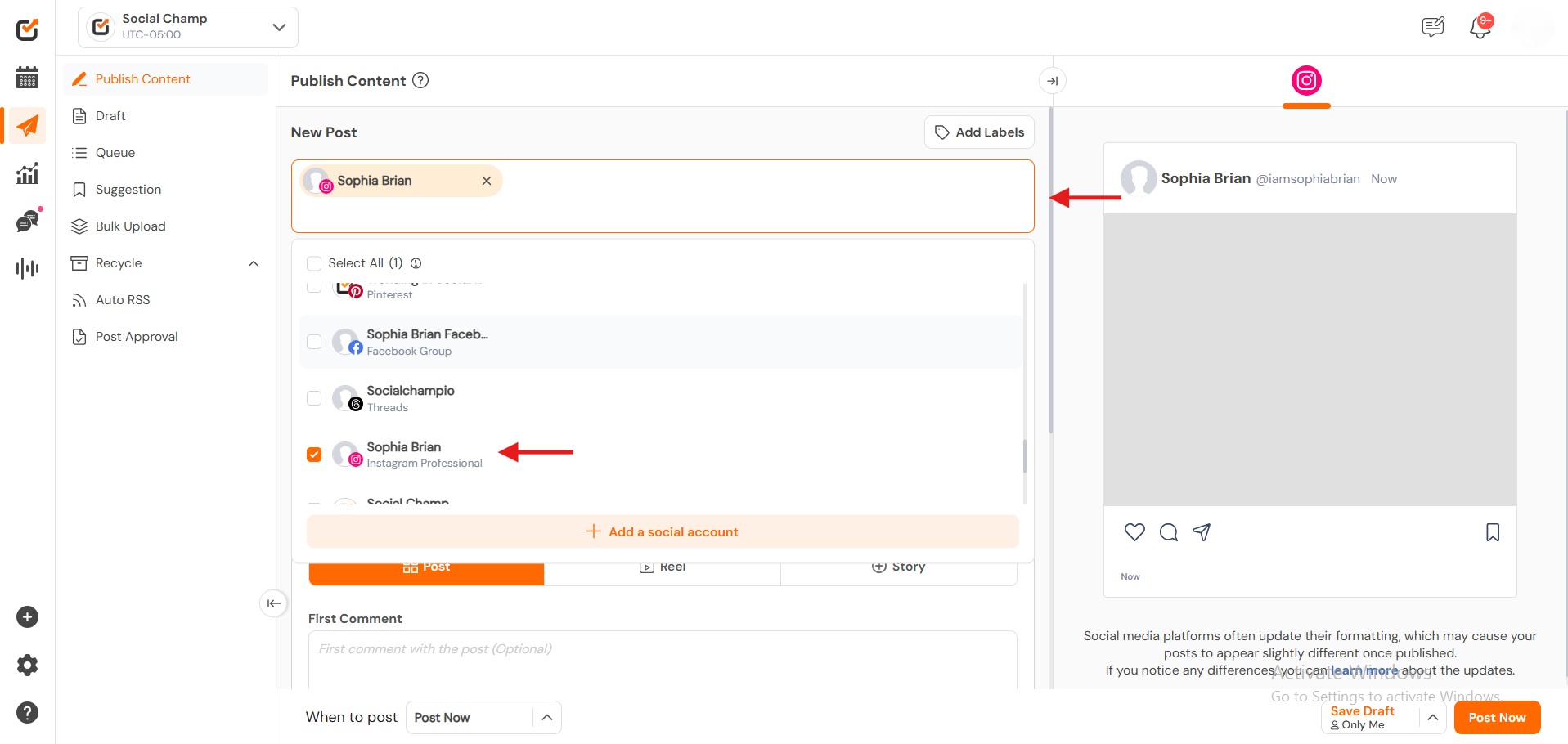 1- First, log in to the platform, and you will be directed to our main content dashboard. Select your added Instagram Business account from the ‘Publish to’ drop-down menu.