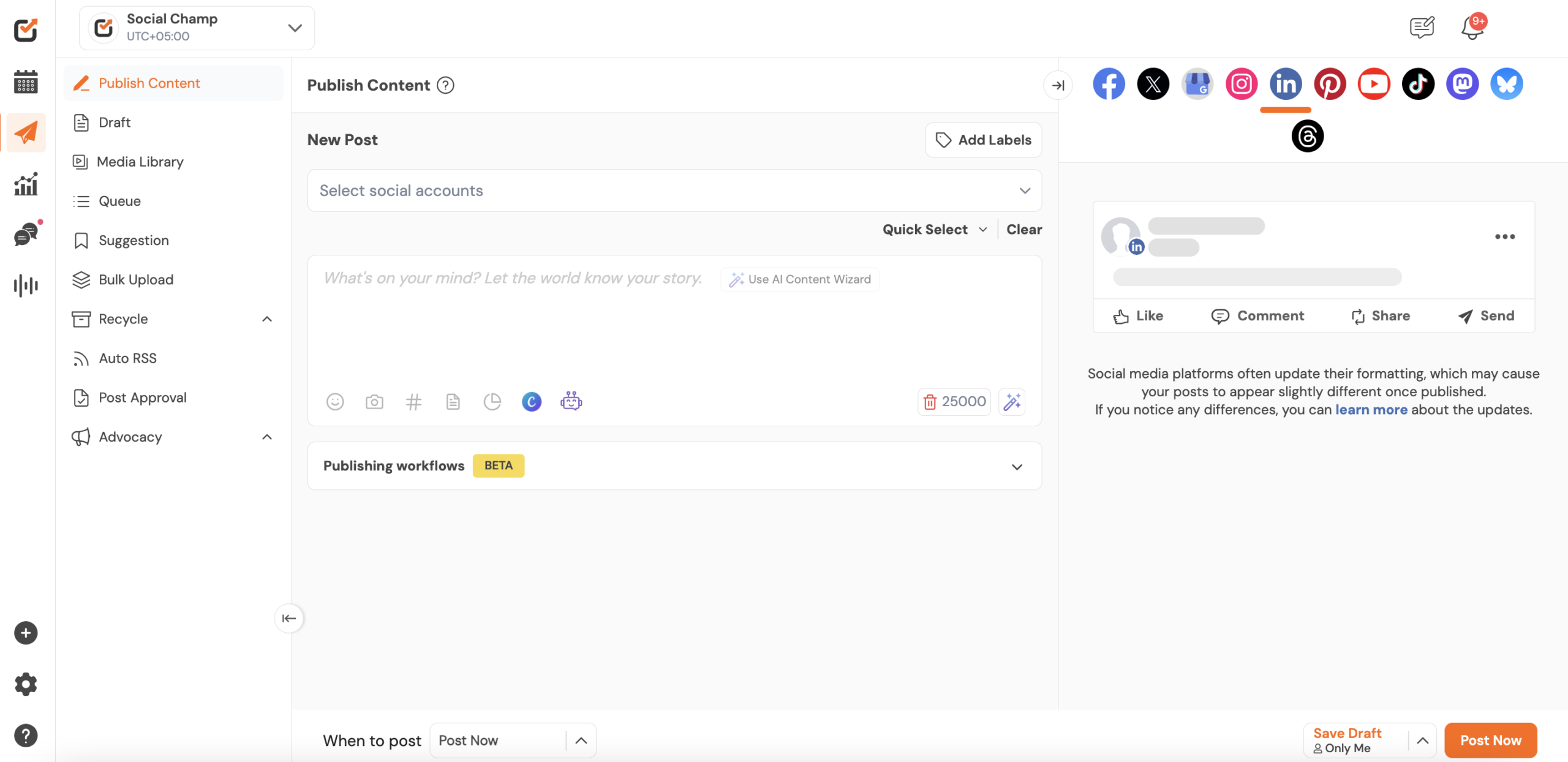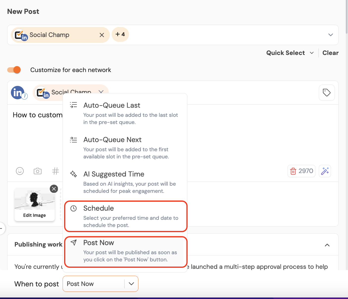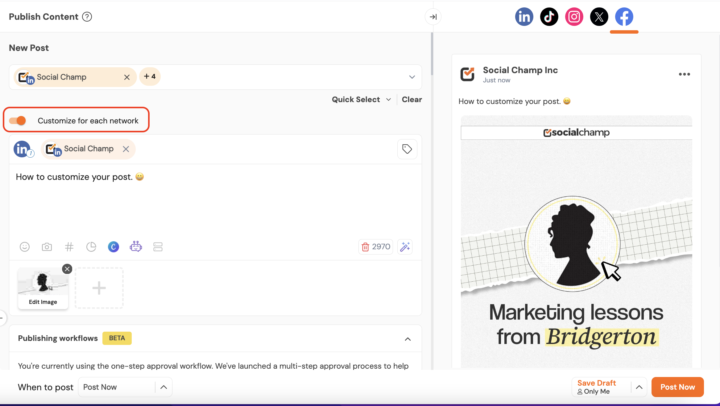 Social Champ’s Customize for Each Network feature allows you to tailor your post for different platforms while scheduling a single one, making sure your content feels native across each channel.